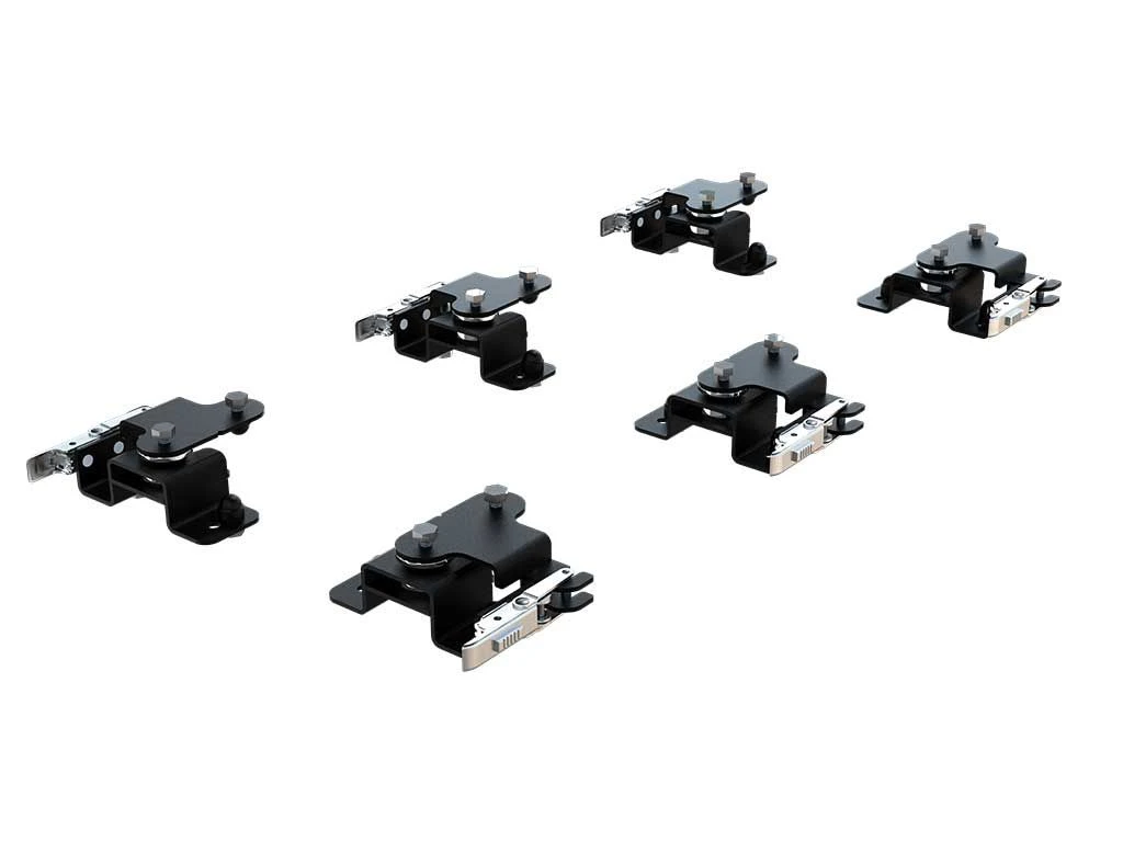 - 6 low profile base brackets are bolted to a Front Runner Rack while 6 self-aligning bushes are secured to the tent base channels using the appropriate Tent Channel Set.