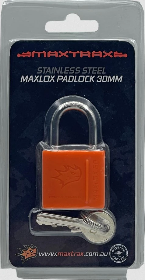 The MAXTRAX MAXLOX 30mm heavy duty Stainless Steel padlock with silicone cover, is designed to protect and also secure your MAXTRAX 4WD Recovery Tracks from potential thieves when they’re mounted on any of your MAXTRAX Mounting Pins. Simply feed the  padlock shank through the padlock hole in the shaft of at least one of the mounting pins and close the padlock.Â