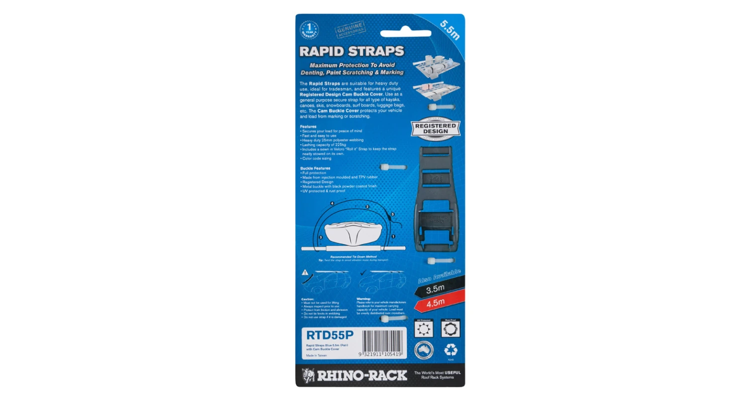 The RTD55P Rapid Straps are suitable for heavy duty use and feature a unique design registered unique Buckle Protector. Designed to encase the metal cam buckle, the Buckle Protector is made from injection moulded, TPV rubber and provides maximum protectio